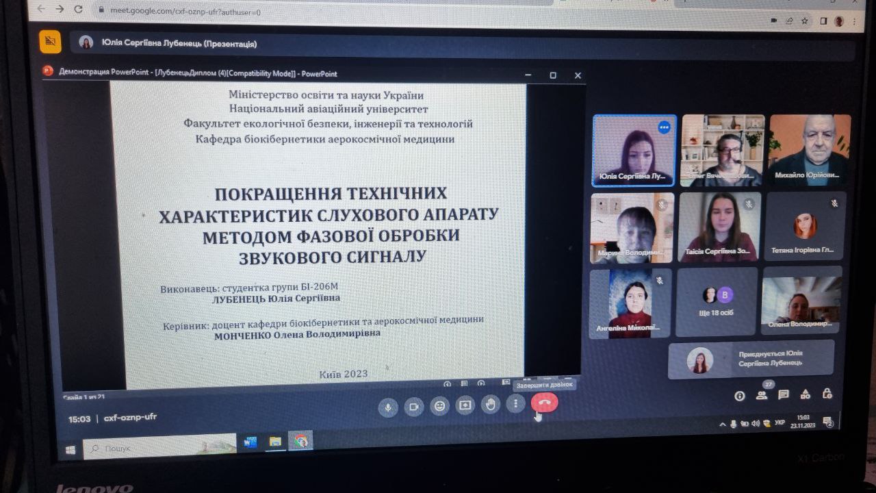 24 листопада 2023 року на кафедрі Біокібернетики та аерокосмічної медицини відбулась VI Студентська науково-практична конференція «Сучасні проблеми та перспективи біомедичної інженерії» . Під покровом листопадового вечора були заслухані 16 учасників, детально розглянуті роботи та отримані цінні зауваження щодо подальшого вдосконалення кожної з робіт. Традиційно порадувало різнобарв'я досліджень : "МОЖЛИВОСТІ МЕДИЧНОГО ДОДАТКУ УЗД НА ОСНОВІ ШТУЧНОГО ІНТЕЛЕКТУ" (Гладка Т., Наук.кер. Кучеренко В.Л.), "МЕТОДИКА ВИЗНАЧЕННЯ ХРОНОТИПУ ЗА ЙОГО ФІЗІОЛОГІЧНИМИ ПОКАЗНИКАМИ" (Дрозд А. Наук.кер. Мельников О.В.), "ВИМІРЮВАННЯ ВІЗУАЛЬНО ПОСИЛЕНОГО ВЕСТИБУЛО-ОЧНОГО РЕФЛЕКСУ ЗА ДОПОМОГОЮ МАТЕМАТИЧНИХ МОДЕЛЕЙ" (Кодій Є. Наук.кер. Монченко О.В.), "МЕТОДИКА АНАЛІЗУ РЕКУРЕНТНОСТІ БІОМЕДИЧНИХ СИГНАЛІВ В ЧАСТОТНІЙ ОБЛАСТІ" (Золотенкова Т., Наук.кер. Буриченко М.Ю.), "ВДОСКОНАЛЕННЯ БІОСЕНСОРНОЇ ТЕХНОЛОГІЇ ДЛЯ ВІДНОВЛЮВАЛЬНОЇ МЕДИЦИНИ" (Шевченко Т., Наук.кер. Кошева Л.О.), ОГЛЯД ЗАСТОСУВАННЯ АЛИТИВНИХ ТЕХНОЛОГІЙ В ЕНДОПРОТЕЗУВАННІ" (Юрков Ф., наук.кер. Барановський М.М.)