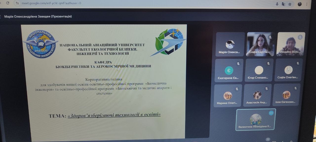 18 квітня на кафедрі Біокібернетики та аерокосмічної медицини відбулася година корпоративної культури на тему " Здоров'язберігаючі технології в освіті" зі студентами БІ-403 та БМ-409 груп. Розглянули причини виникнення факторів, що впливають на здоров'я студентів, обговорили структуру та типи оздоровчих технологій. куратор Кучеренко В.Л.