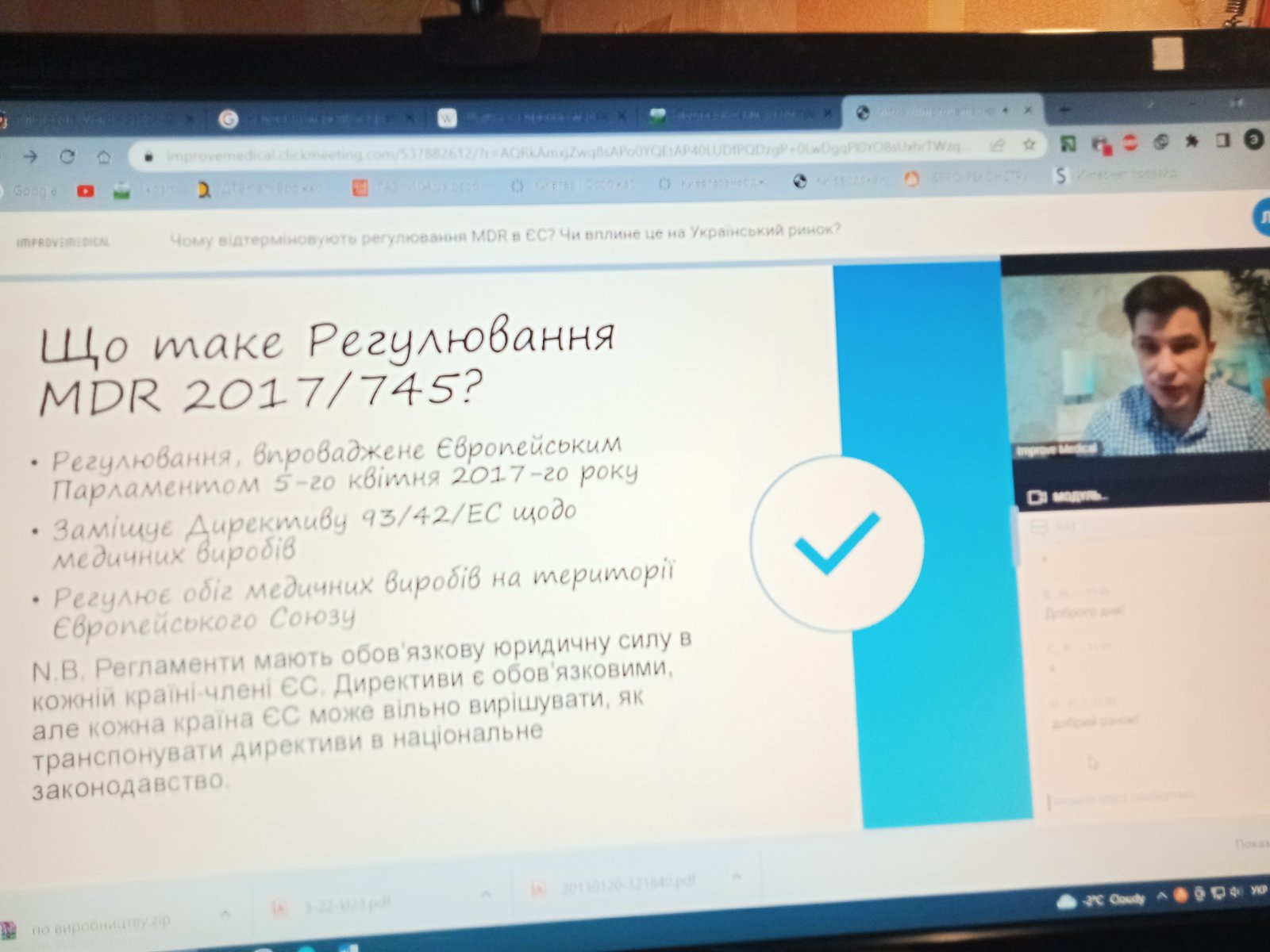 У минулу пятницю 27 січня відбувся вебінар з нагальних питань оцінки відповідності медичних виробів відповідно до нової Директиви ЄС. На вебінарі була присутня завідувач кафедри БІКАМ, отримала актуальну інформації щодо зміни завконодавства у цьому питанні, особливостей практичної реалізації. Це буде корисним для актуалізації дисциплін, що викладаються на 2 та 4 курсі "Технічне регулювання та оцінка відповідності" та "Контроль якості і безпечності медичних виробів. Відома організація Improve Medical з оцінки відповідності планує ще серію вебінарів з нагальних цікавих питань, корисних для студентів та викладачів кафедри.