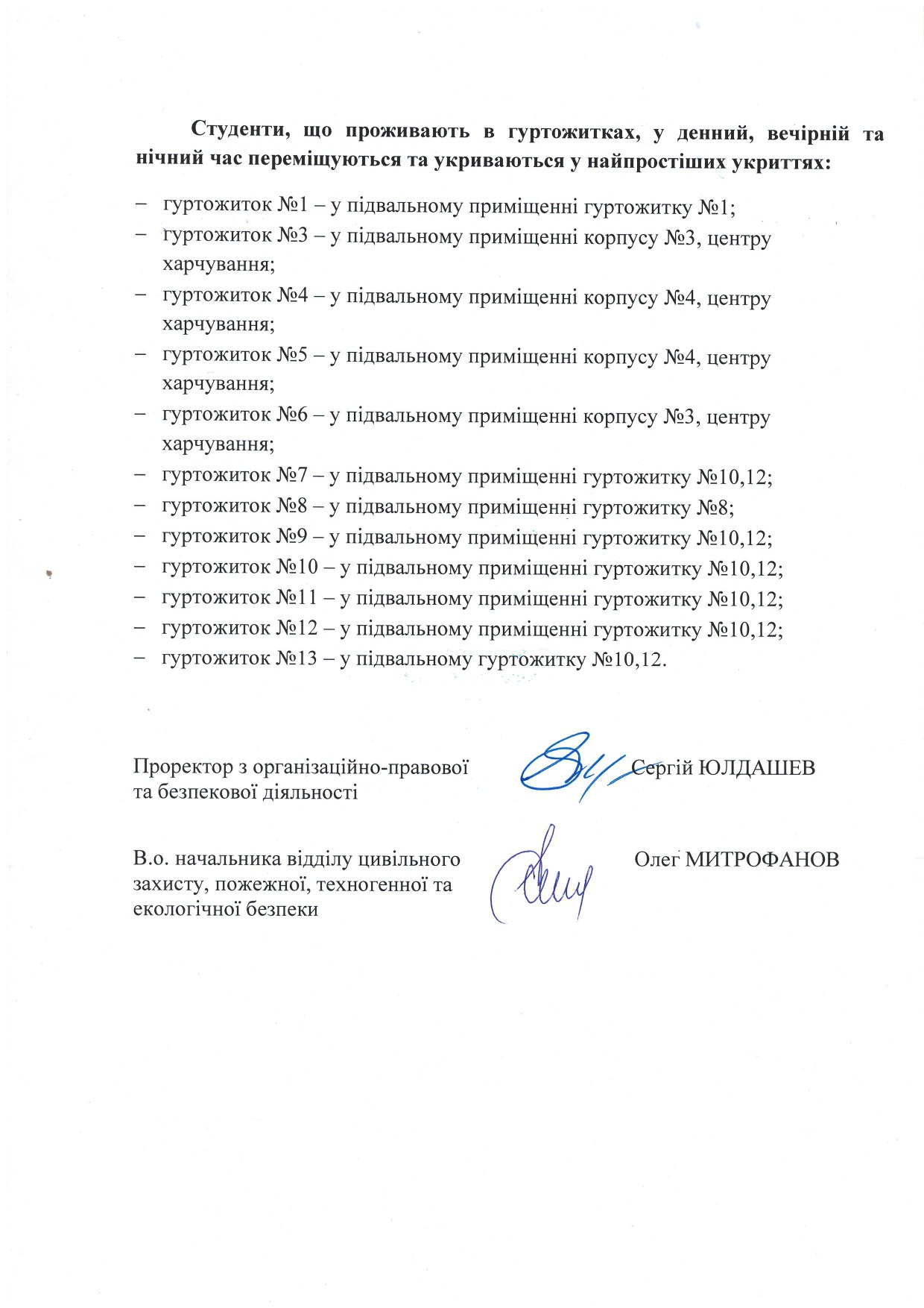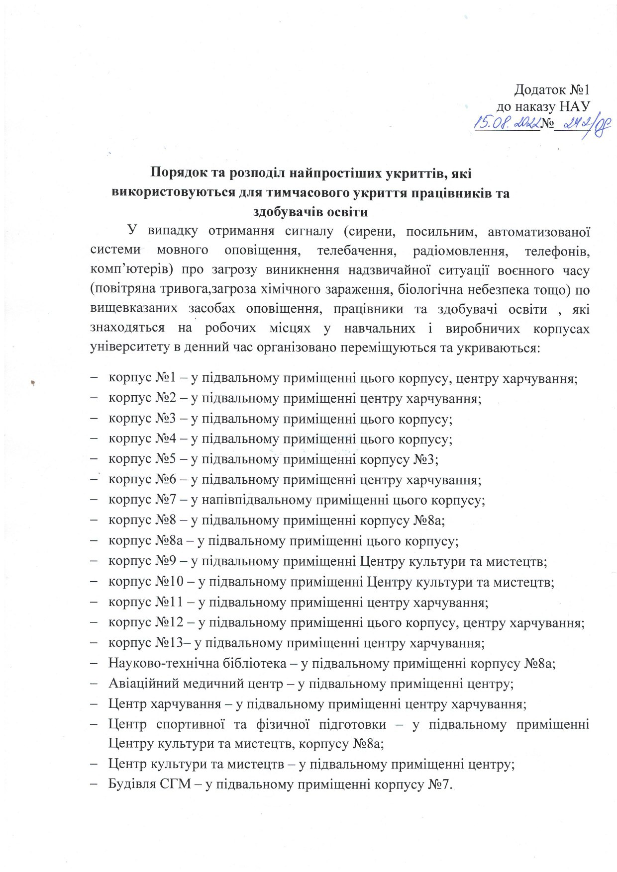 - положень Інструкції щодо дій персоналу НАУ у разі виникнення надзвичайних ситуацій, затвердженої наказом від 26.07.2022 р. №222/од.